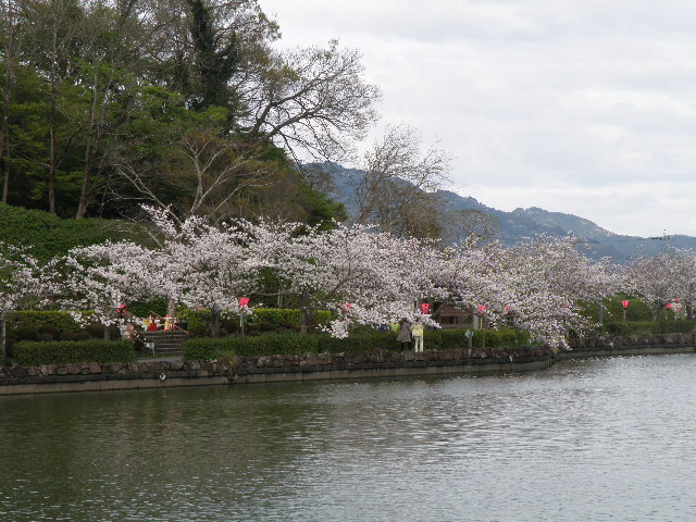 蓮華寺池の周囲は約1.5㌔、周囲には満開の桜で訪れた人々の目を和ましてくれています。